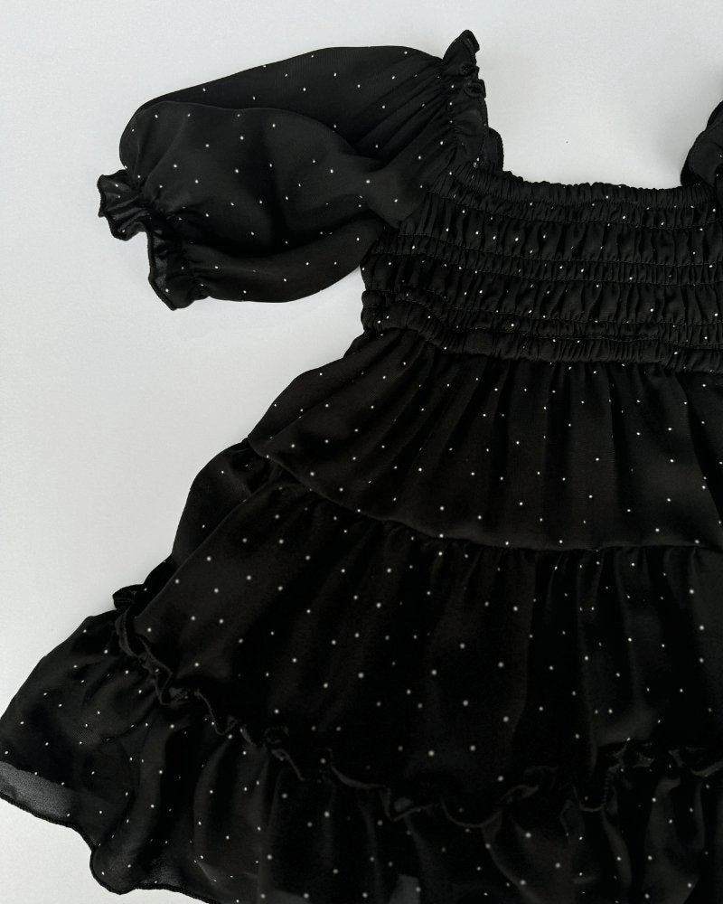 Turn heads with the Katherine mommy and me dresses in black with dainty white dots. Crafted to deliver elegance with a lively twist, whether you're stepping out for a stylish brunch or enjoying a leisurely stroll, this ensemble is sure to accentuate the beautiful bond between mom and daughter.