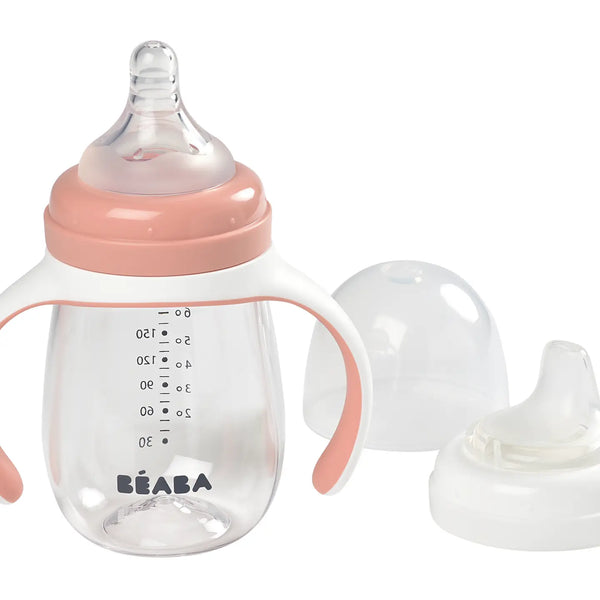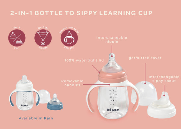 At 4mo+, start with this 2-in-1 Bottle To Sippy Learning Cup, which is fitted with an interchangeable bottle nipple to silicone spout to help ease babies transition from breast to cup in their first drinking endeavors. The entire range is 100% watertight and leak-proof, open or closed or upside down. Use them at home or on the go – the range has been specifically designed with spill and temperature control in mind. Learning cup nipples are interchangeable, all spouts and straws made from 100% supple silicone, and the handles, which can help baby hold the bottle, can be removed if needed. As always materials are BPA, Lead & Phthalate free.