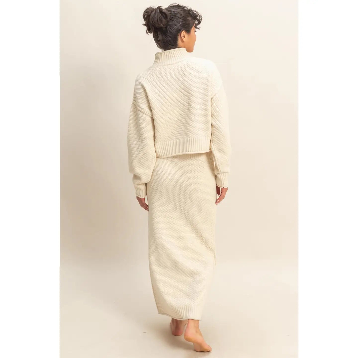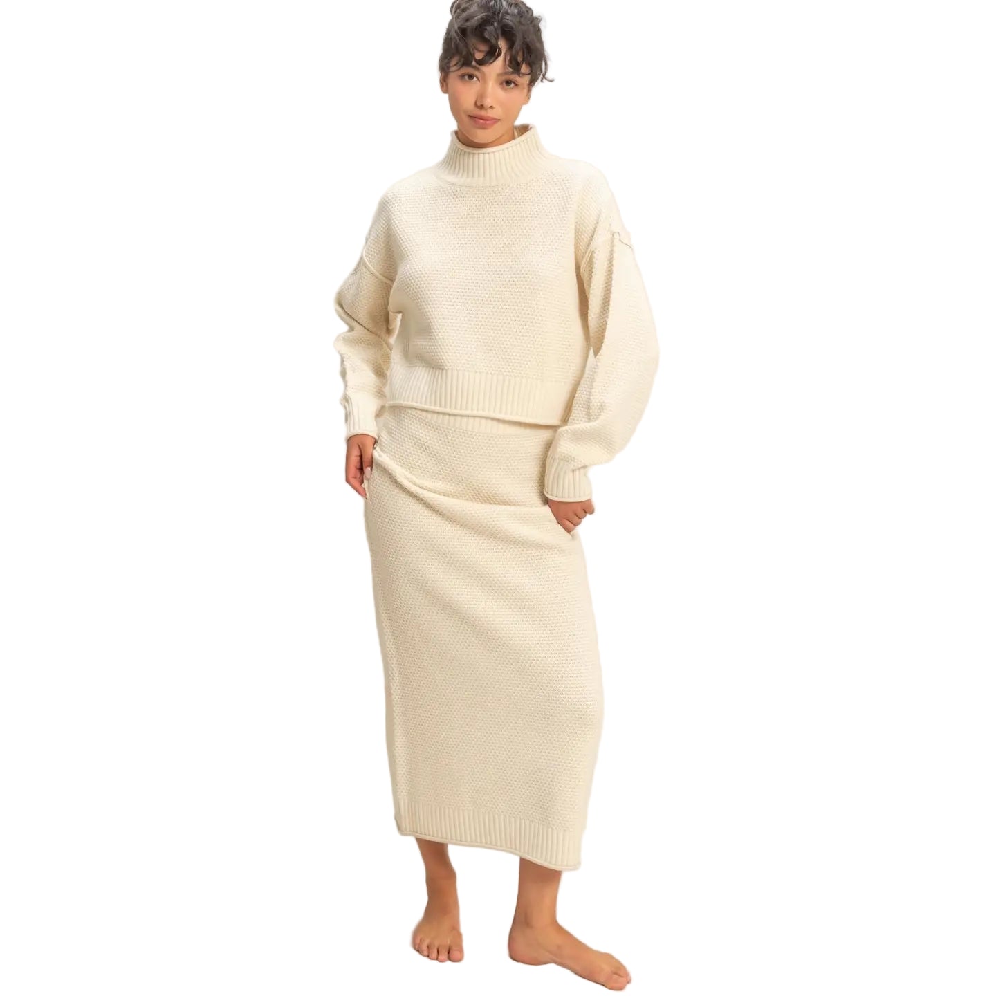 This coordinated set features a textured high neck sweater and a matching long skirt that offers both comfort and style. Its relaxed fit is ideal for layering, making it perfect for chilly days or casual evenings. Pair with minimal jewelry and loafers for a polished look. The versatility ensures it can transition from office to outings effortlessly. 100% Acrylic