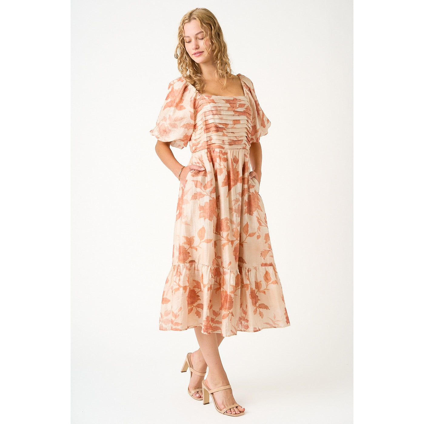 Floral print midi dress with short puff sleeves, side pockets and an invisible zipper on side. Square neck with pleated detailing on chest and elastic smocked back.