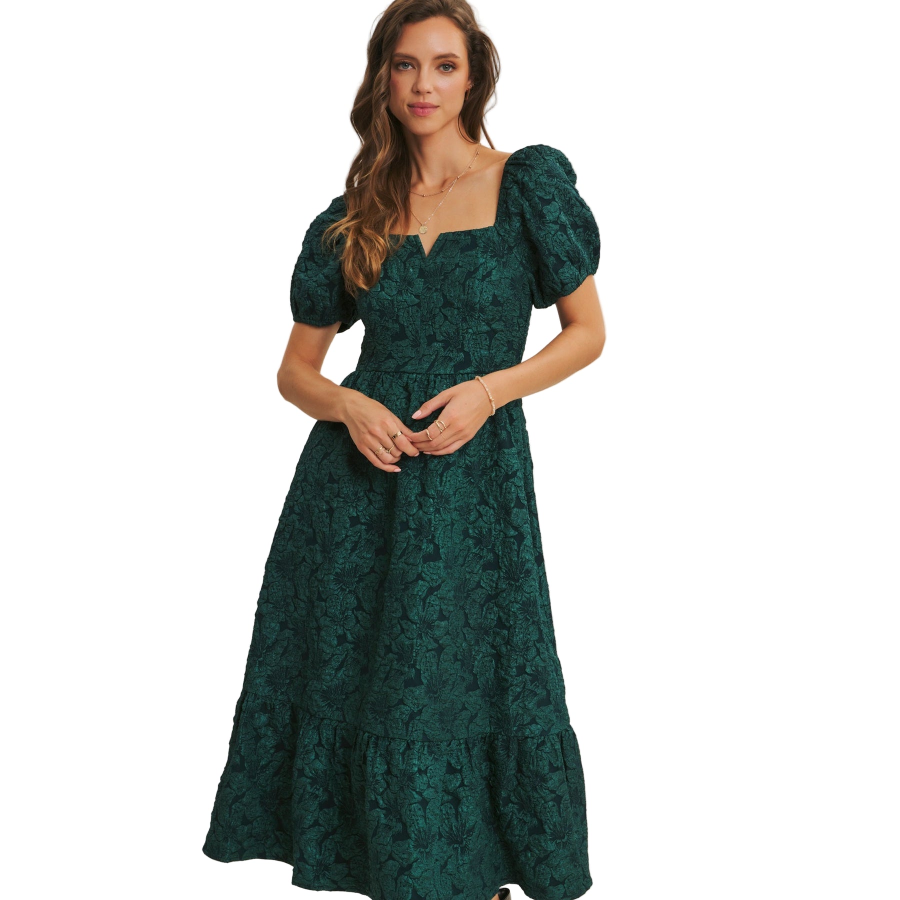 Floral jacquard midi dress with short puff sleeves and side pockets.  V-neck wire detail at bodice and smocked back. Self: 98% Polyester 2% Spandex, Lining: 97% Polyester 3% Spandex.