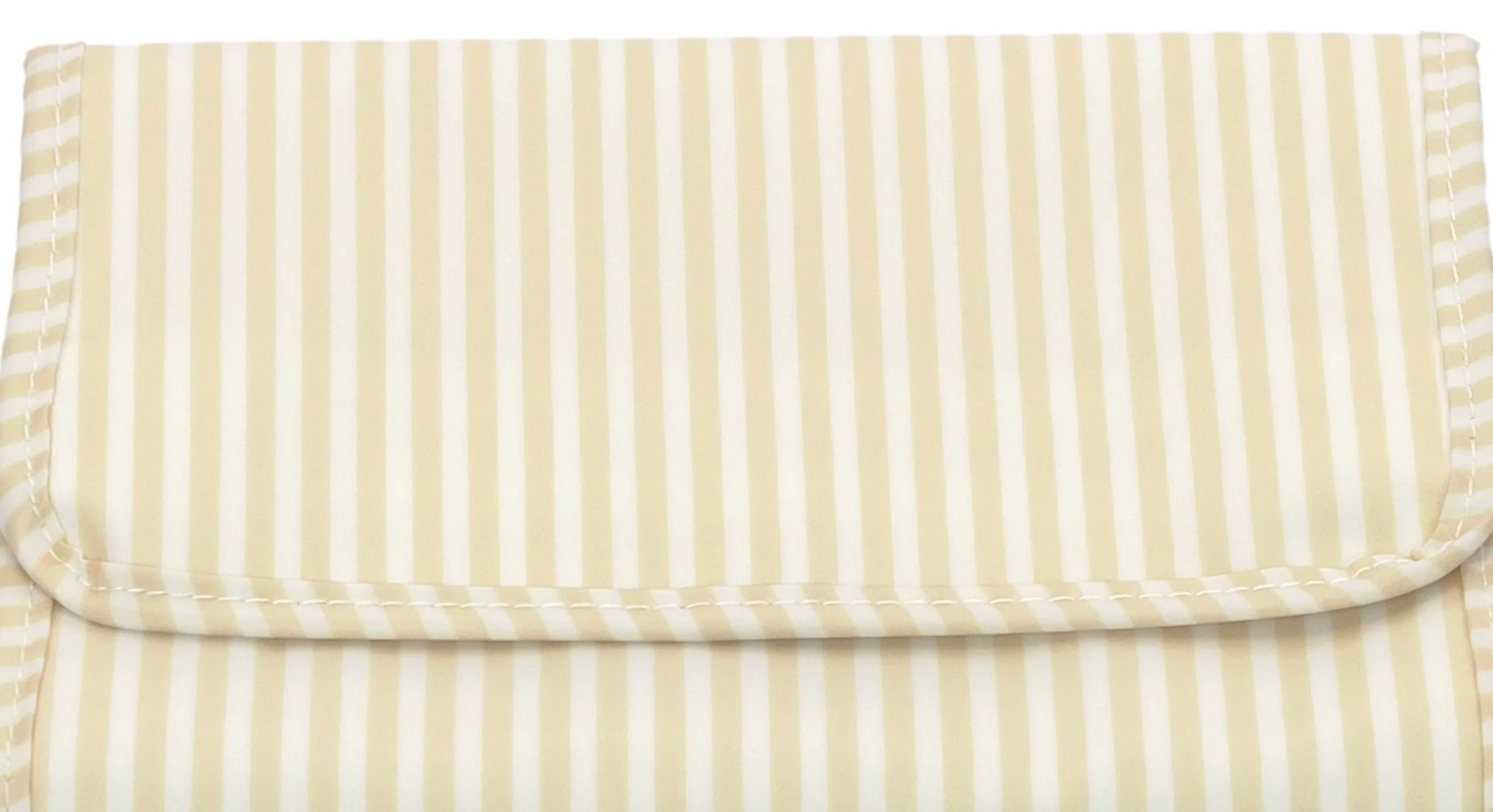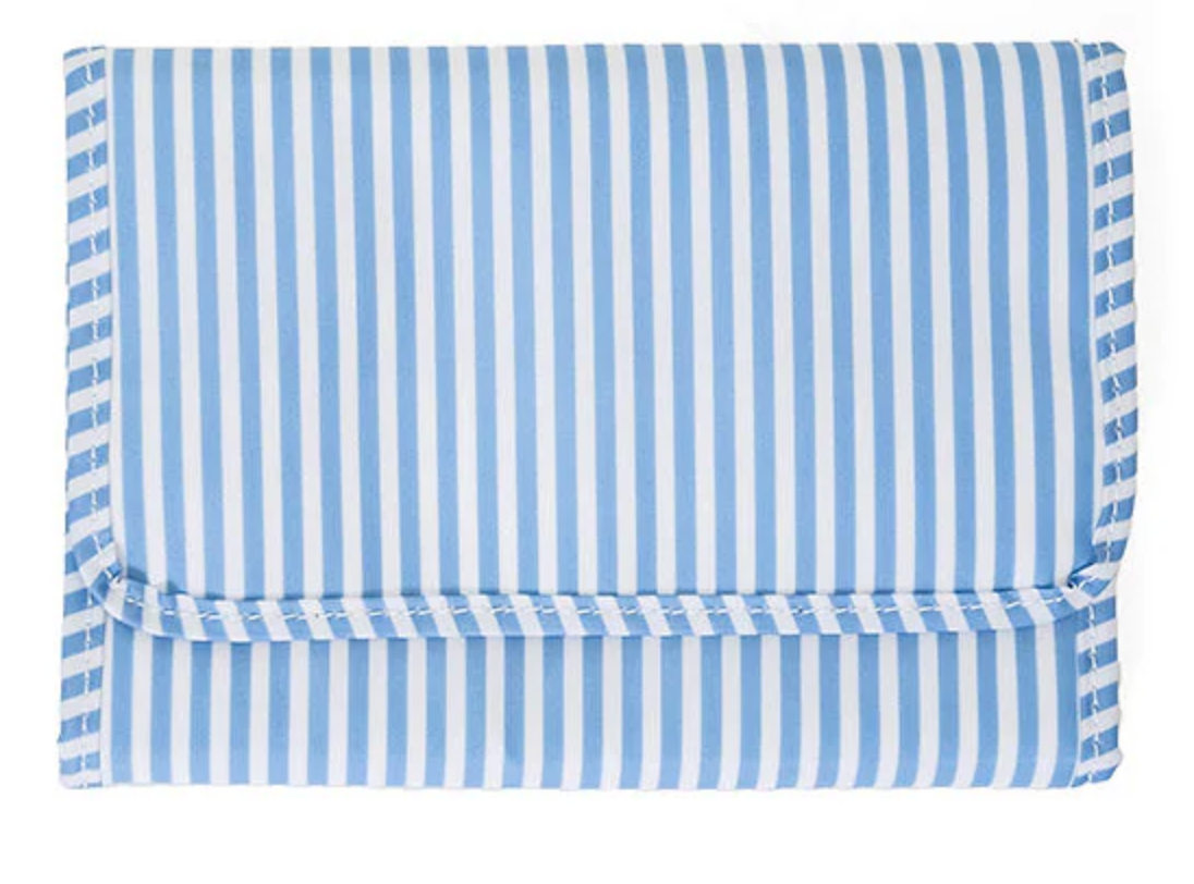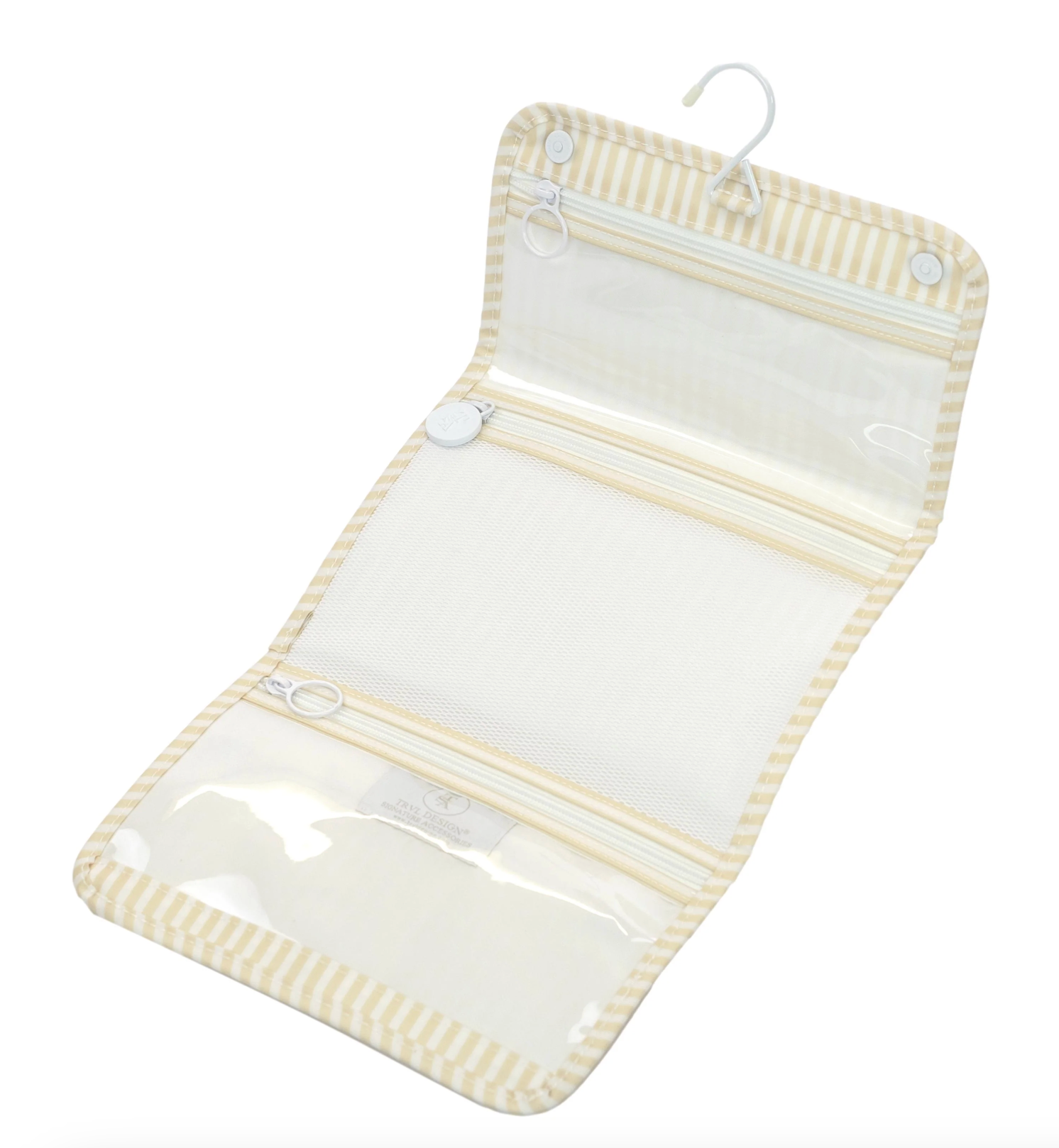 This cute Mini Rollup foldable hanging toiletry bag with ample pockets keep overnights and family trips organized! Features three interior pockets: 2 clear + 1 stretch mesh, snap closure, and a sturdy built-in hook that allows you to hang this bag anywhere.