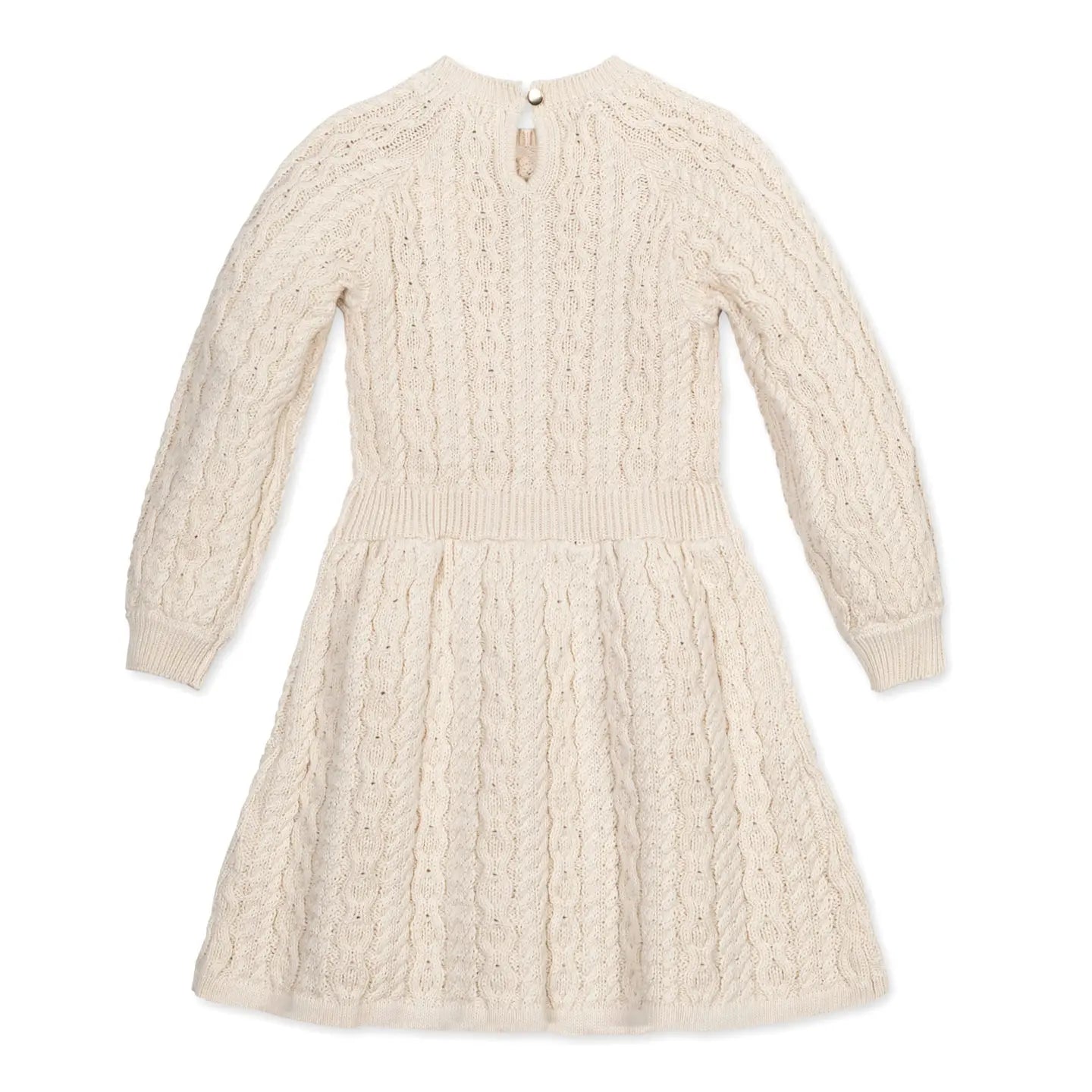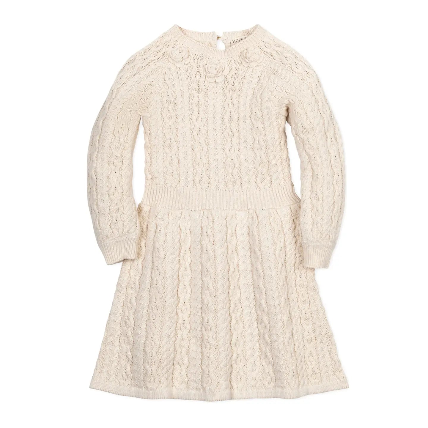 Your girl will be so chic and comfortable in this soft organic cotton cable knit sweater dress. Features a beautiful allover stitch, hand knit rosettes at the neckline, comfy raglan sleeves, and a gold button at the back keyhole closure. An absolutely darling look that is perfect for the holidays and beyond.