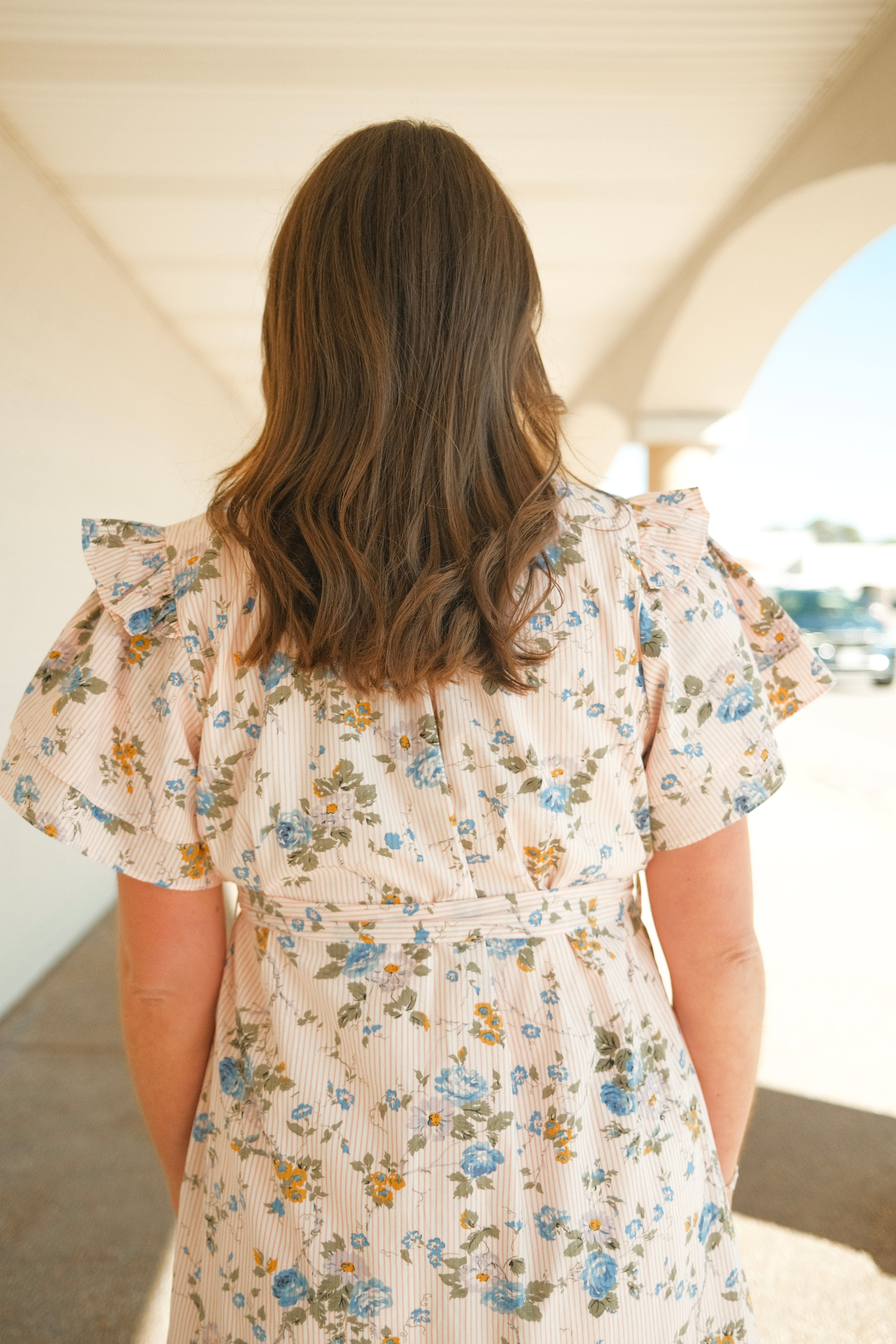 Floral print short sleeve double layer short sleeve pullover midi dress featuring ruffle accents over shoulder and skirt. Front button closure with tie. Self waist tie. Lined. Woven. Non-sheer. Lightweight. 100% cotton.
