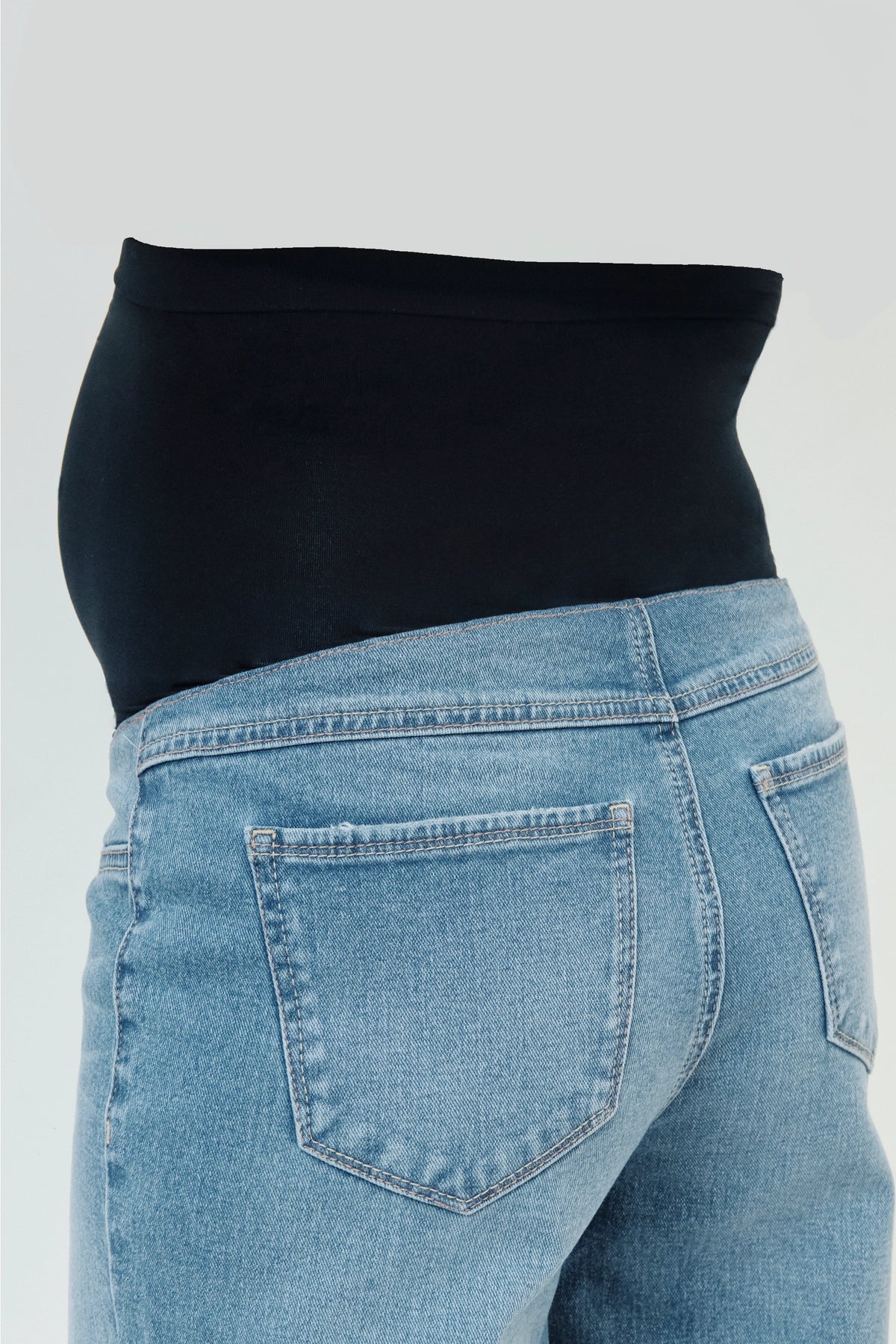 This maternity cuffed jean features a wide straight leg with a loose, relaxed fit. Mamas like to be Trendy too!!!! Super comfortable and supportive bellyband stretches over your bump, with 2 faux front pockets, 2 back pockets, and that perfect clean denim, perfect for any occasion. : 7.5" Leg Opening: 20.5" Inseam: 30.5"