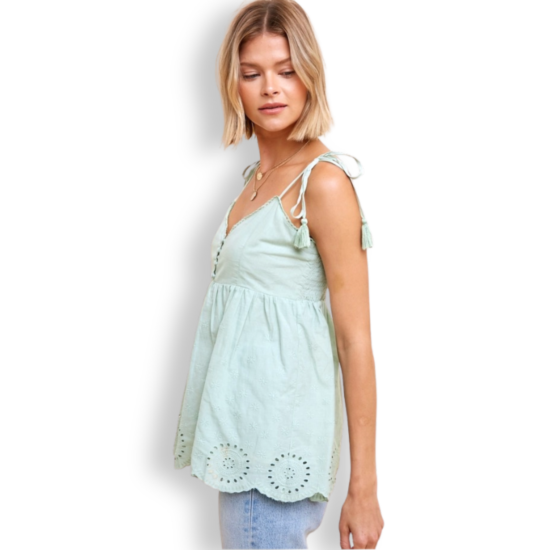 Cotton eyelet lace babydoll cami. Features fully functional buttons, v-neck, smock backing, tassle end self tie straps, and lining. Self: 100%cotton, Lining: 100%rayon, Lace: 100%cotton.
