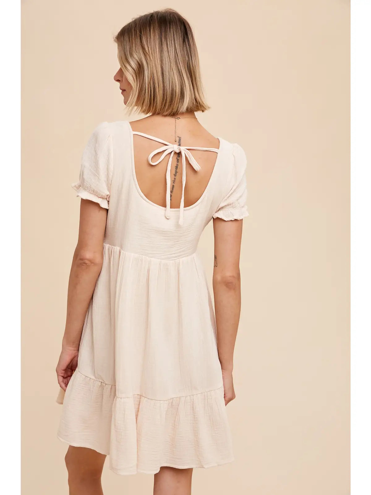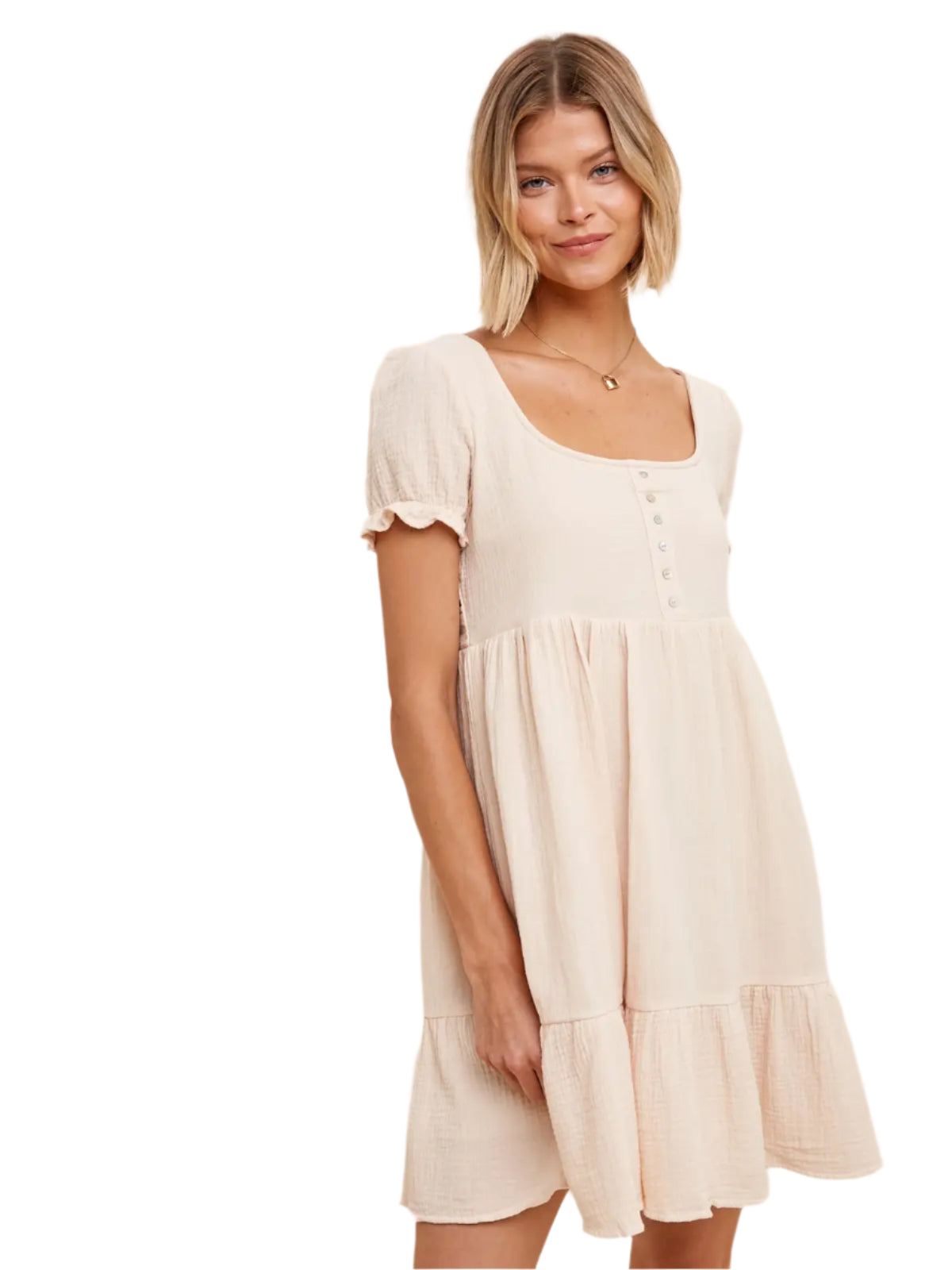 The perfect flirty flowy mini dress for this spring and summer! Features button detail, scoop neckline, flounce hem, and puff sleeves. Self: 100%cotton Lining: 100%polyester.