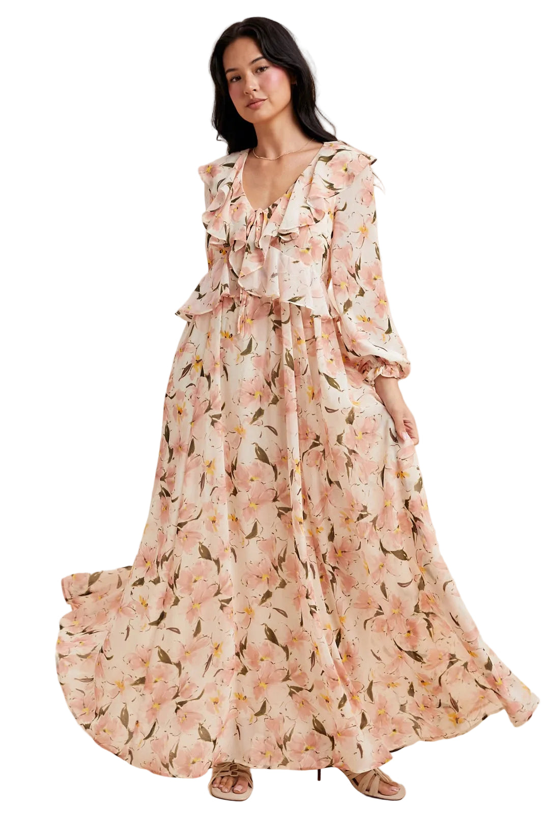 Maxi dress features a floral chiffon fabrication, ethereal ruffles along neck and waist, voluminous sleeves, elastic waistband at back, hidden side zipper, side pockets and lining.