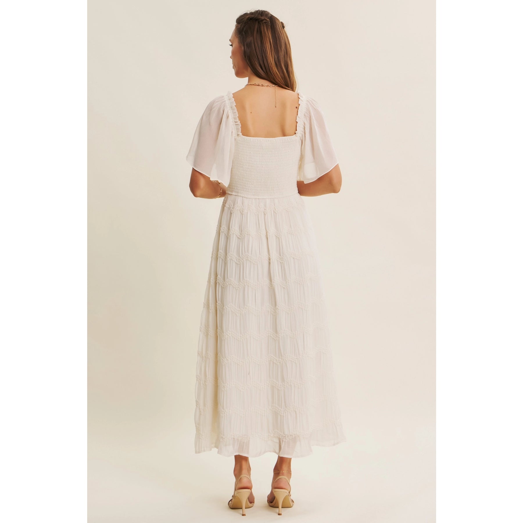 Smocked midi dress with flutter sleeves and front bow. Can be worn on or off the shoulder.  Self, Contrast: 100% Polyester;  Lining: 97% Polyester 3% Spandex