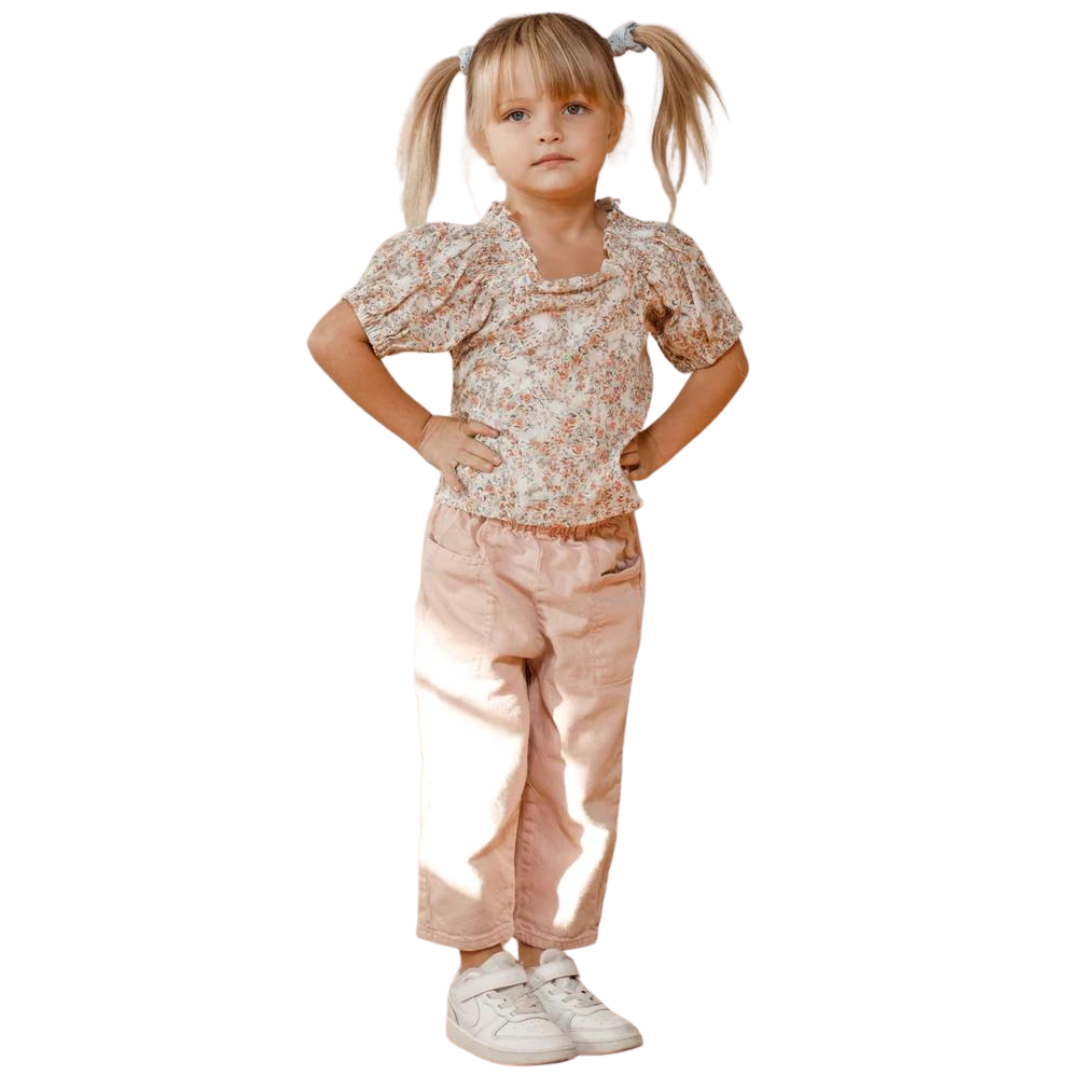 Puff short sleeve blouse with smocking detail on the shoulder.  Comes in matching mom sizes too!