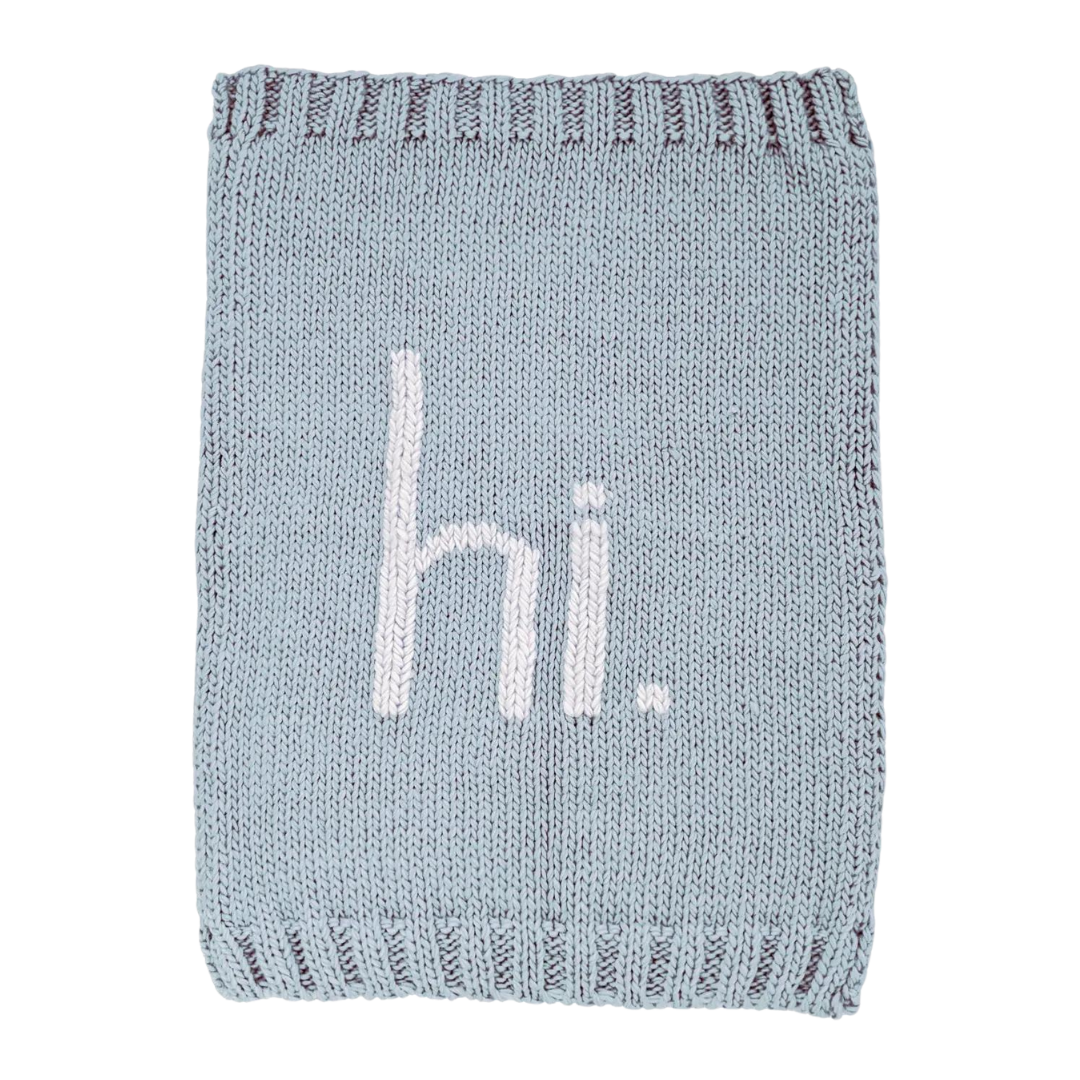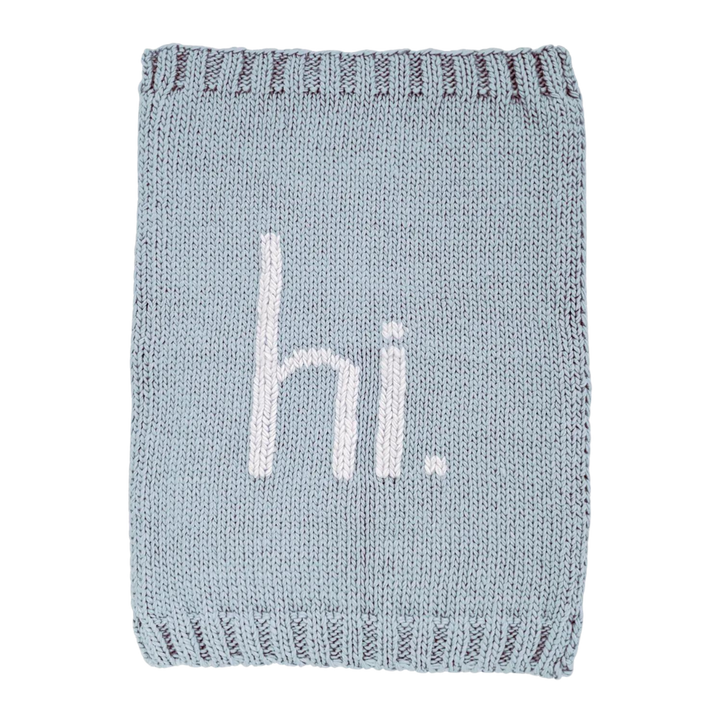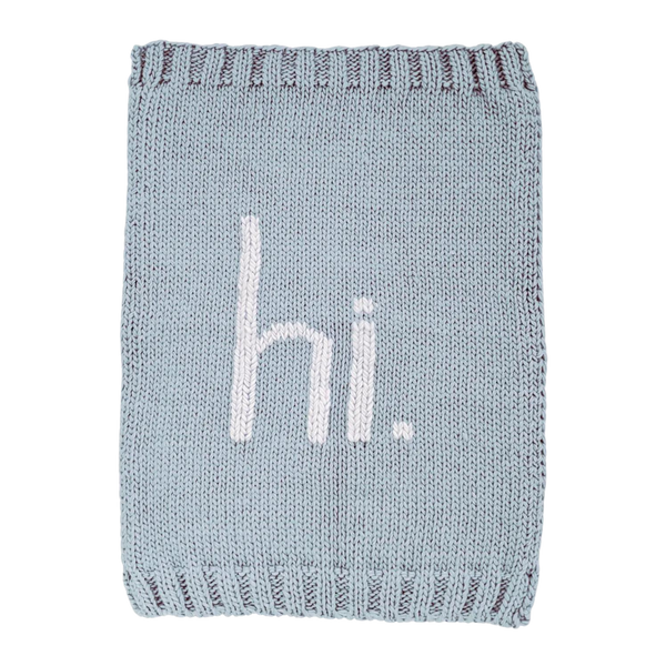 What a cute way to greet the world! This blanket is hand knit in cozy Icelandic acrylic yarn with the word 'hi.' in duplicate stitched in natural colored yarn. This is perfect for hospital and first photos and makes a wonderful baby shower gift. Get the matching hi. Beanie for a complete set. Blanket measures 18" x 24" • 100% acrylic • cold handwash, lay flat to dry.
