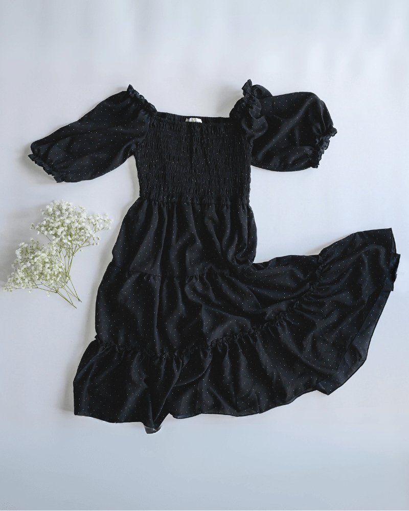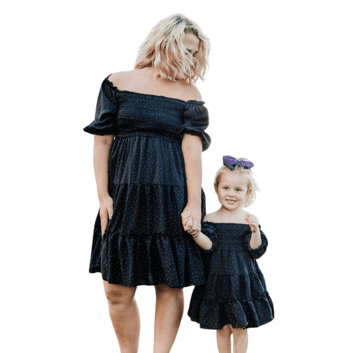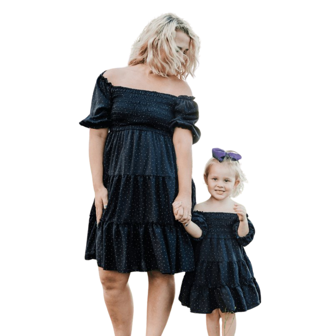 Turn heads with the Katherine mommy and me dresses in black with dainty white dots. Crafted to deliver elegance with a lively twist, whether you're stepping out for a stylish brunch or enjoying a leisurely stroll, this ensemble is sure to accentuate the beautiful bond between mom and daughter.