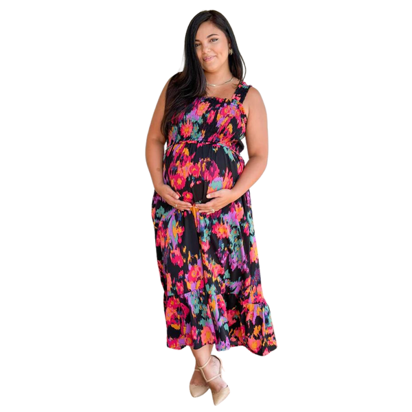 Printed sleeveless maxi dress featuring smocking detail. Lined. Woven. Non-sheer. Lightweight.