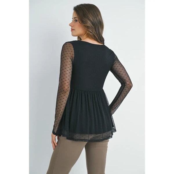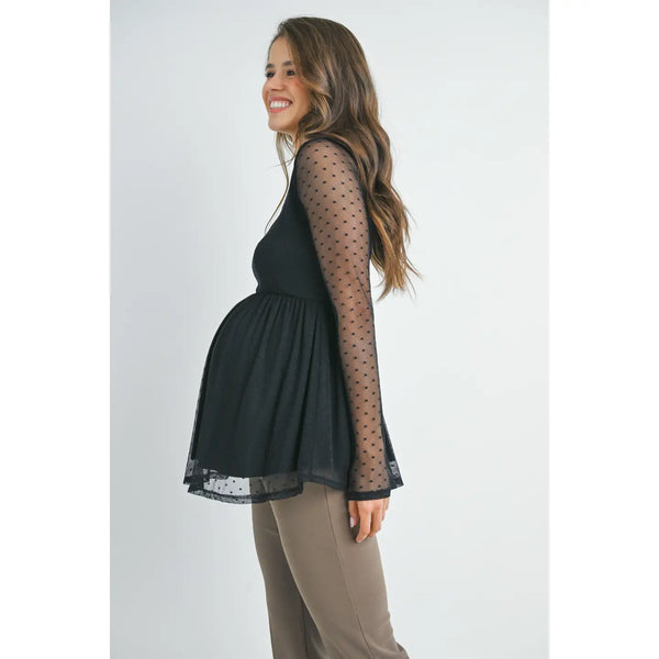 Polka dot sheer mesh contrast long sleeve maternity black top with inner lining.