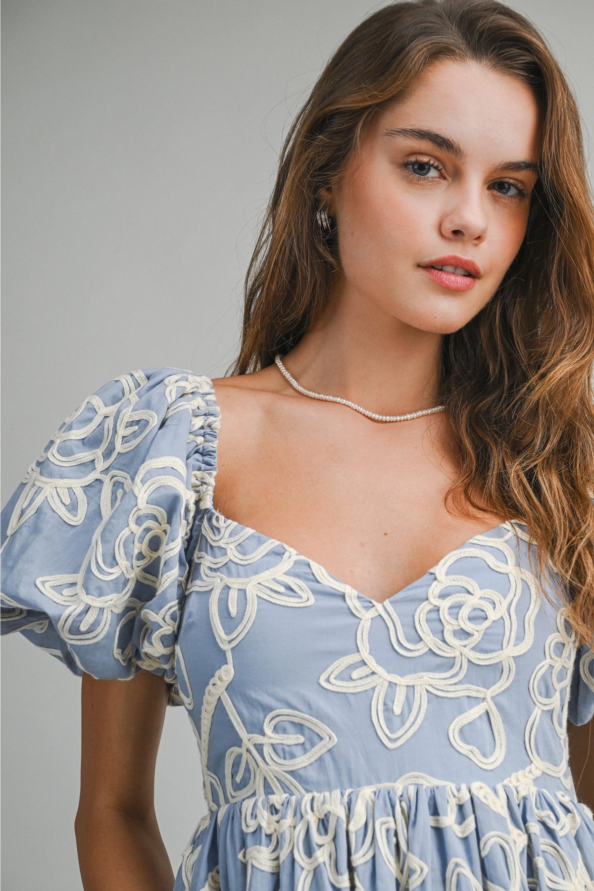 A romantic midi dress featuring a sweetheart neckline, smocked back with voluminous puff sleeves and a softly gathered empire waist. Self: 100% Cotton, Lining: 100% Polyester.