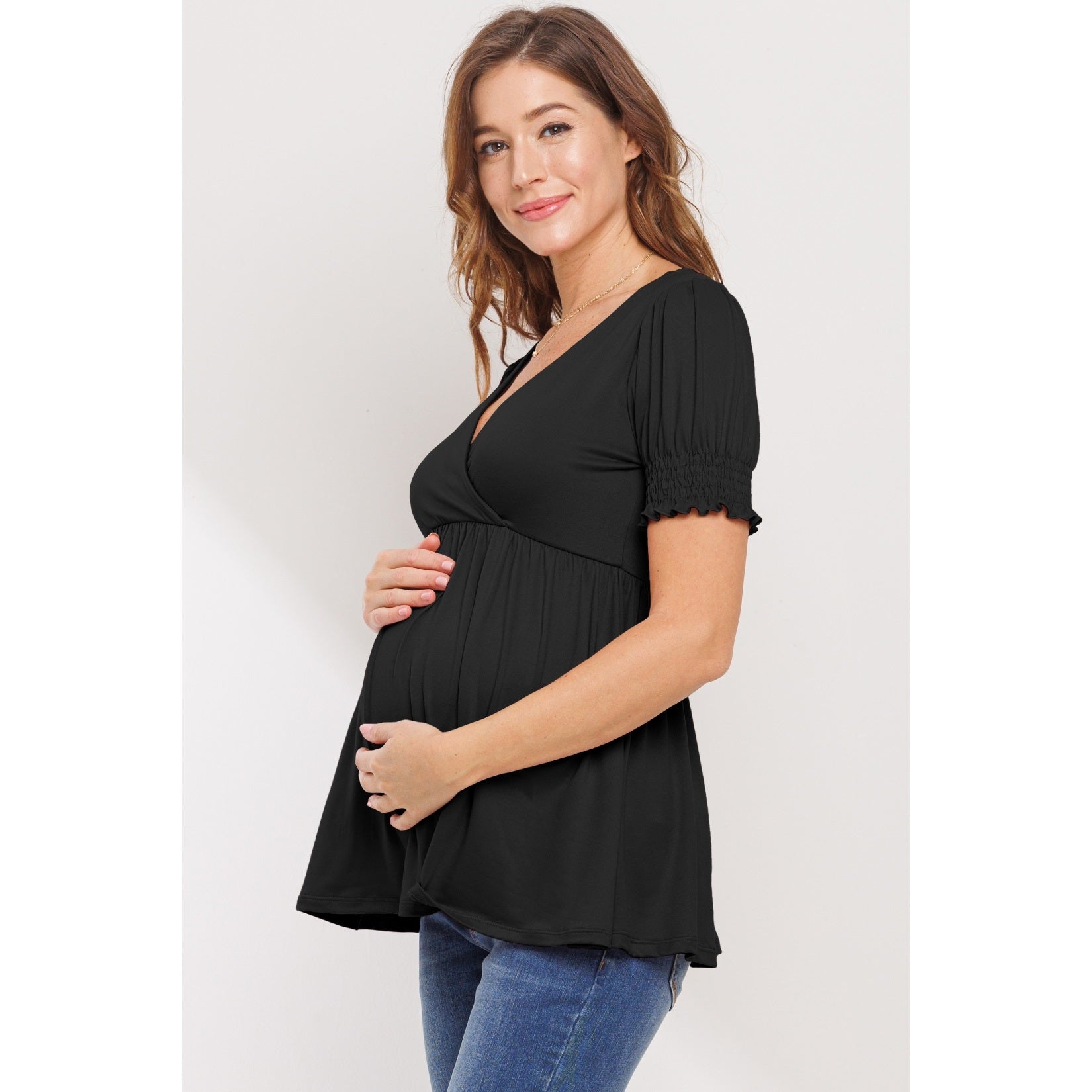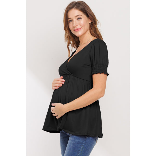 Solid surplice, V-neck smocked short sleeve maternity nursing top.