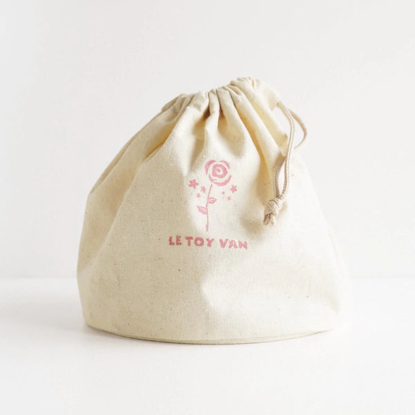 Be a star! Inside the Le Toy Van Star Beauty Bag you'll find an assortment of wooden accessories including a vintage perfume bottle with a bulb atomizer, a hand held mirror, a hair dryer, a comb, a shell compact make up kit, a lotion, a nail varnish, a lipstick and a powder puff.  Made from sustainable rubberwood, gold paint finish and high quality natural cotton.