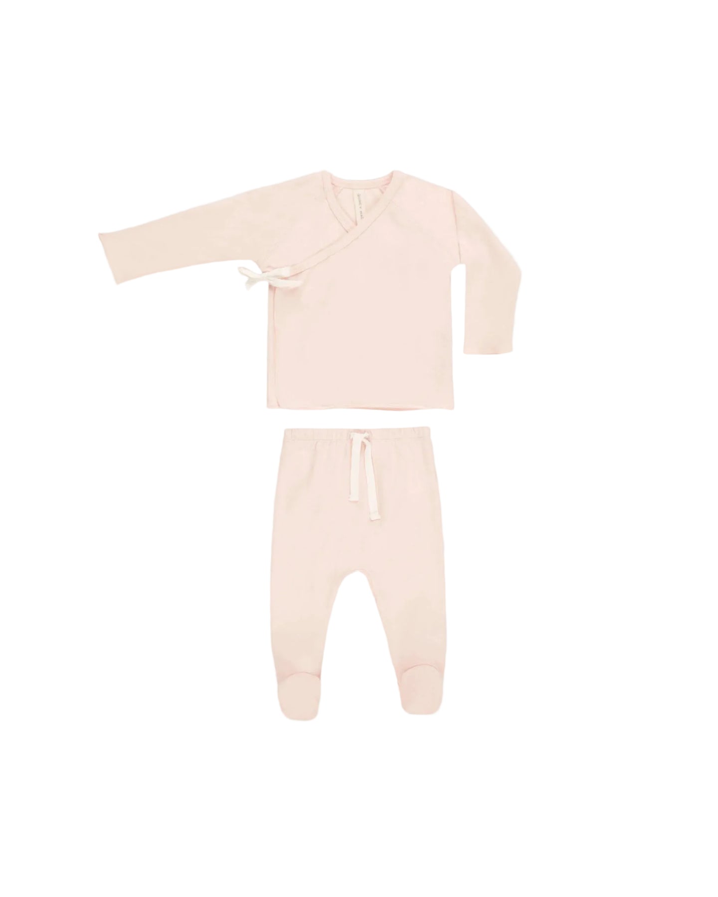 This sweet set features a long sleeve wrap top with a soft side-tie and hidden interior snap for easy dressing, paired with cozy footed pants with a gentle drawstring waist. The knotted baby hat is a soft staple to keep little heads cozy and comfy. The adjustable knot ensures a snug fit as your baby grows, making it as practical as it is adorable. Made for newborn snuggles and those first precious months at home.