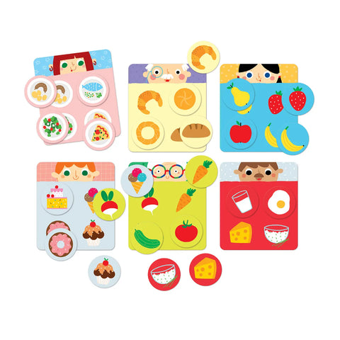 Hungry for fun? Put the food in order and enjoy! This bingo set for toddlers contains 6 boards and 24 large tokens that can be mixed and match in different scenarios. You can: play classic bingo (match the foods and drinks tokens to the boards), experiment with 30 game ideas (for example encourage the child to point and name different food, play a guessing game, encourage a little cooking with you, use the illustrations for an articulation game and many more) or introduce your own rules and enjoy the ‘yummy’ game.